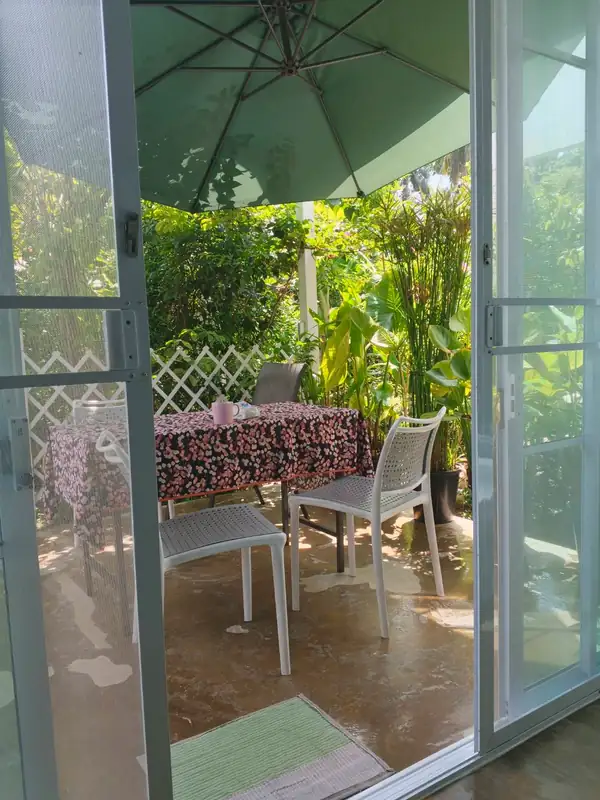The entire house is built on stilts 50 cm above ground level, and the entrance is accessed via a wide, three-step external staircase from the garden to the terrace.