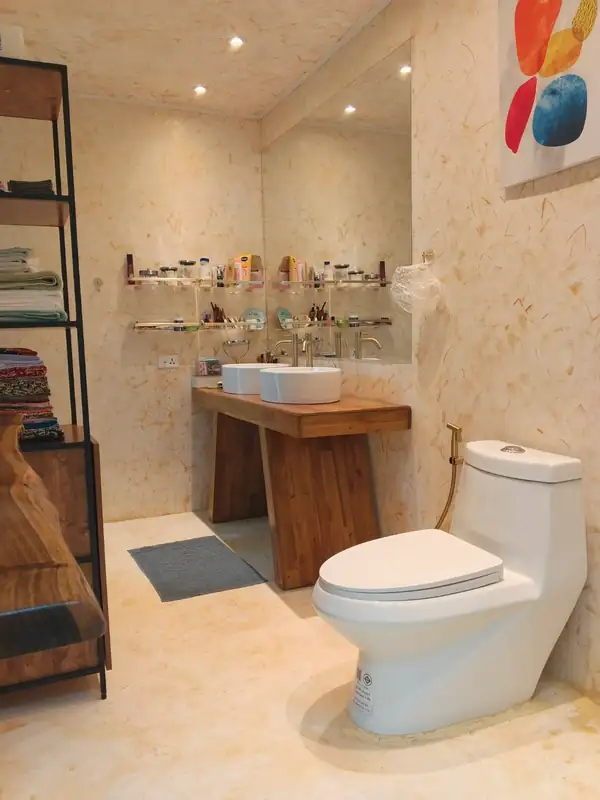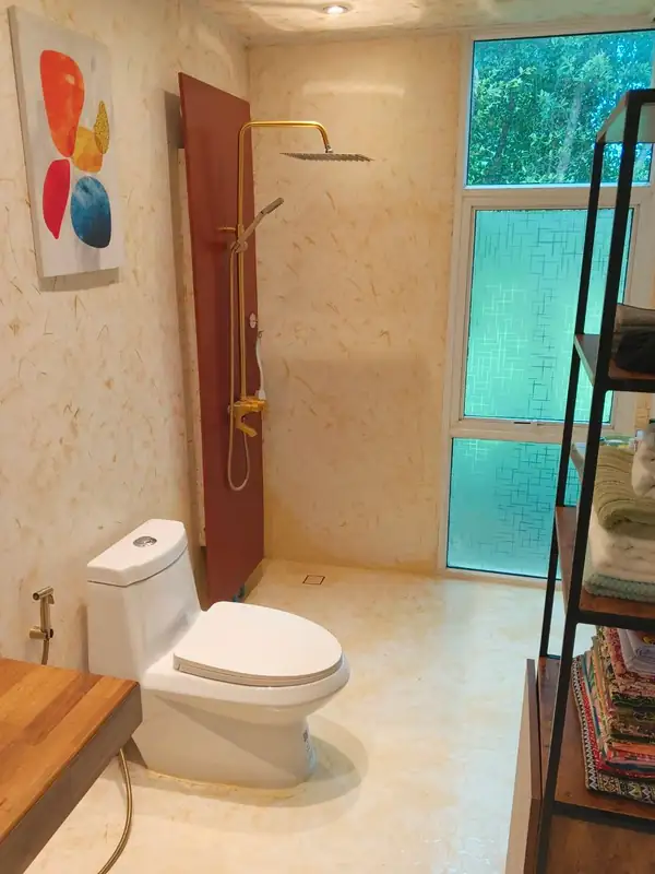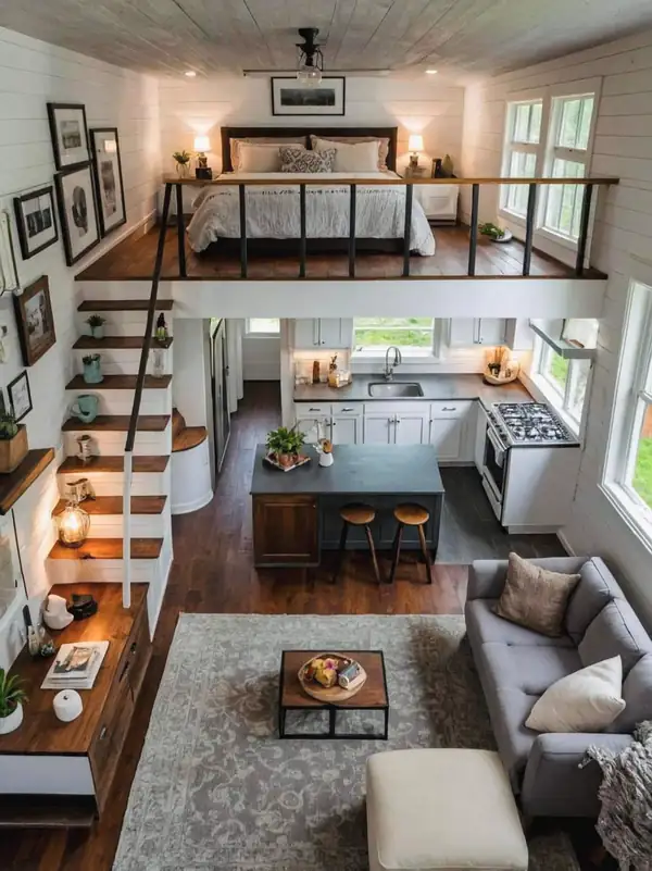 The houses come standard with a functional kitchen, built-in gas stove and sink, and a bathroom with a modern European-style toilet, hot water shower, and a double vanity. A staircase leads to a sleeping loft on the upper, semi-open mezzanine level.