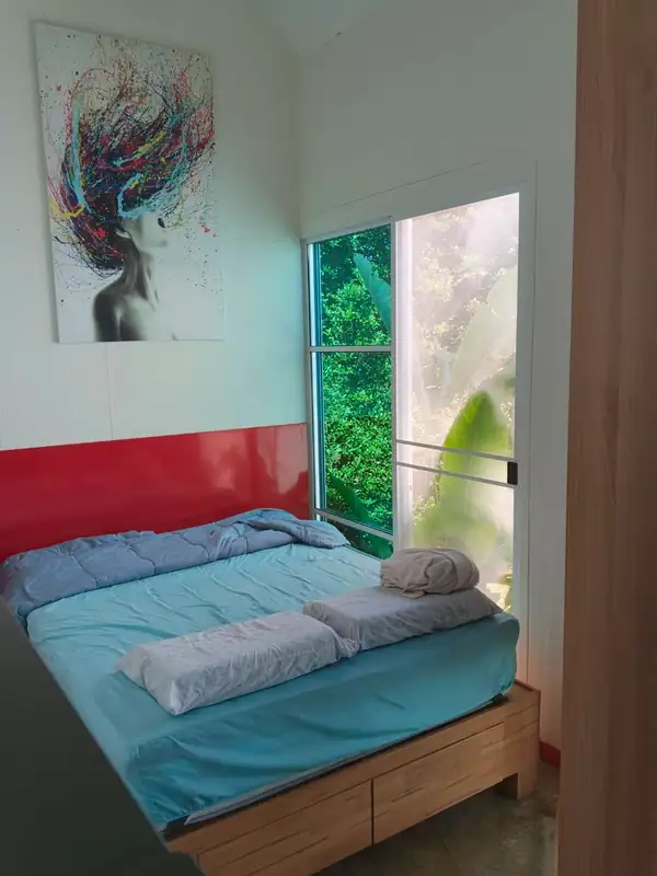 Upon request, a house without the mezzanine is also available, but equipped with the standard kitchen and bathroom described. The monthly rent is then reduced to €220.